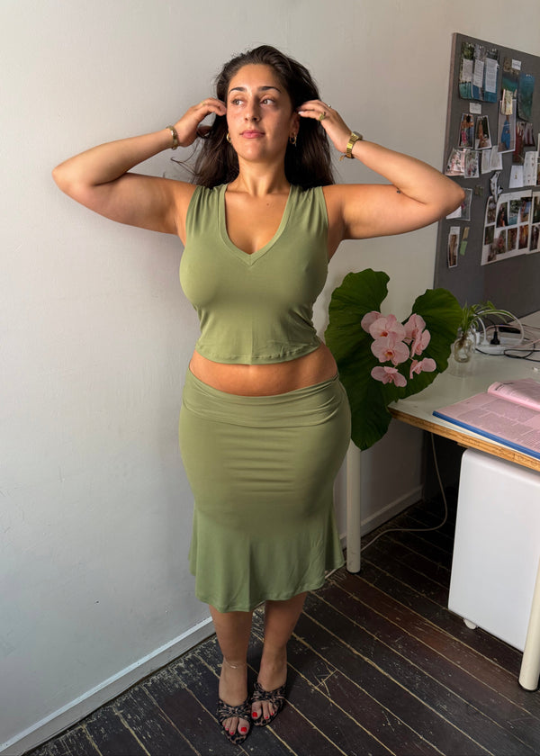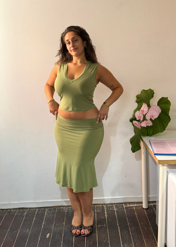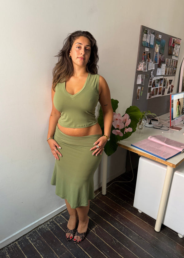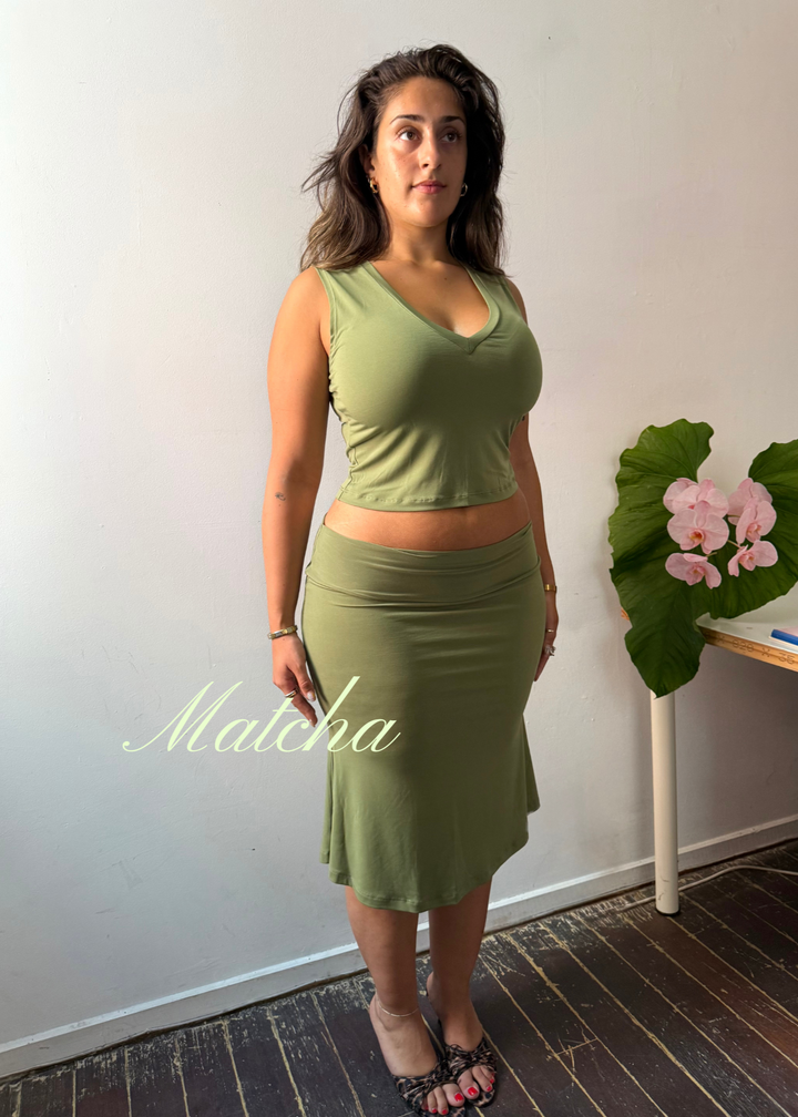 This timeless set pairs a fresh tank edition of our signature V-neck top with a fold-over midi skirt—blending sophistication, comfort, and versatility in two rich hues: Matcha & Coffee.