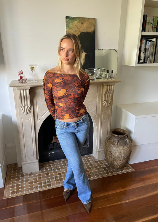 Long sleeve top - 'Peony Leopard' mesh with contrast yellow stitching